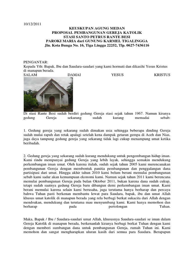 Adapun bantuan dana sebagaimana dalam daftar Rincian Anggaran Biaya RAB oleh karena itu kami sangat mengharapkan bantuan dari BapakibuSaudarai Donatur untuk dapat memberikan bantuan dana pembangunan Gedung Gereja baru tersebut sesuai dengan harapan warga Jemaat GKE Marantha Pitis demikian Proposal. These are so many great picture list that could become your creativity and informational purpose of Contoh Surat Permohonan Bantuan Pembangunan Gereja design ideas on your own collections.